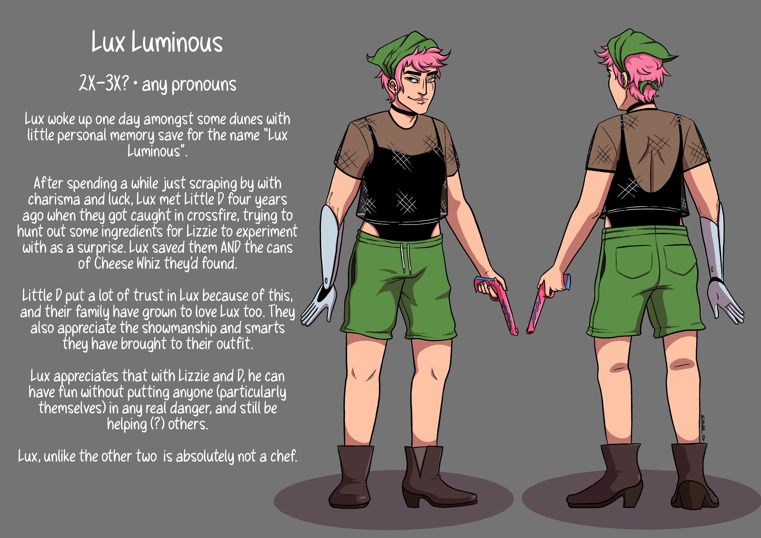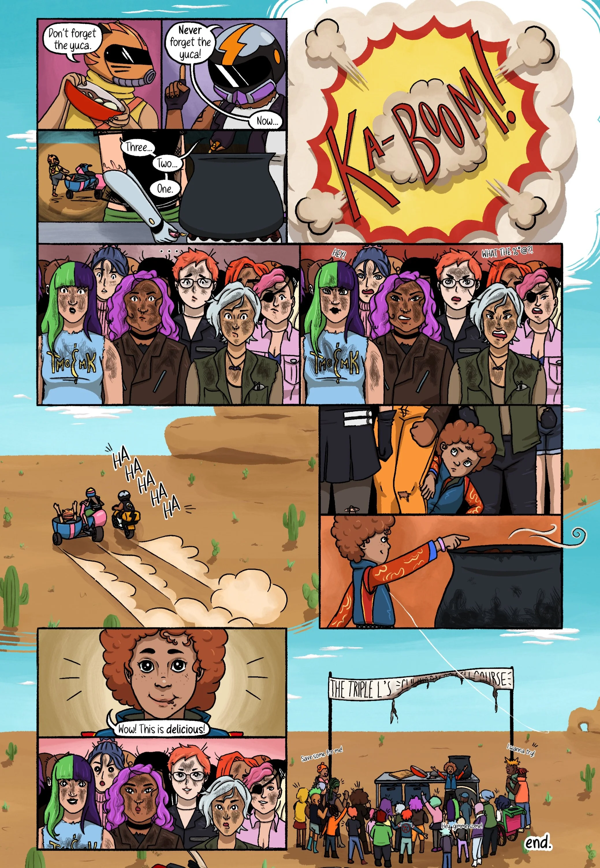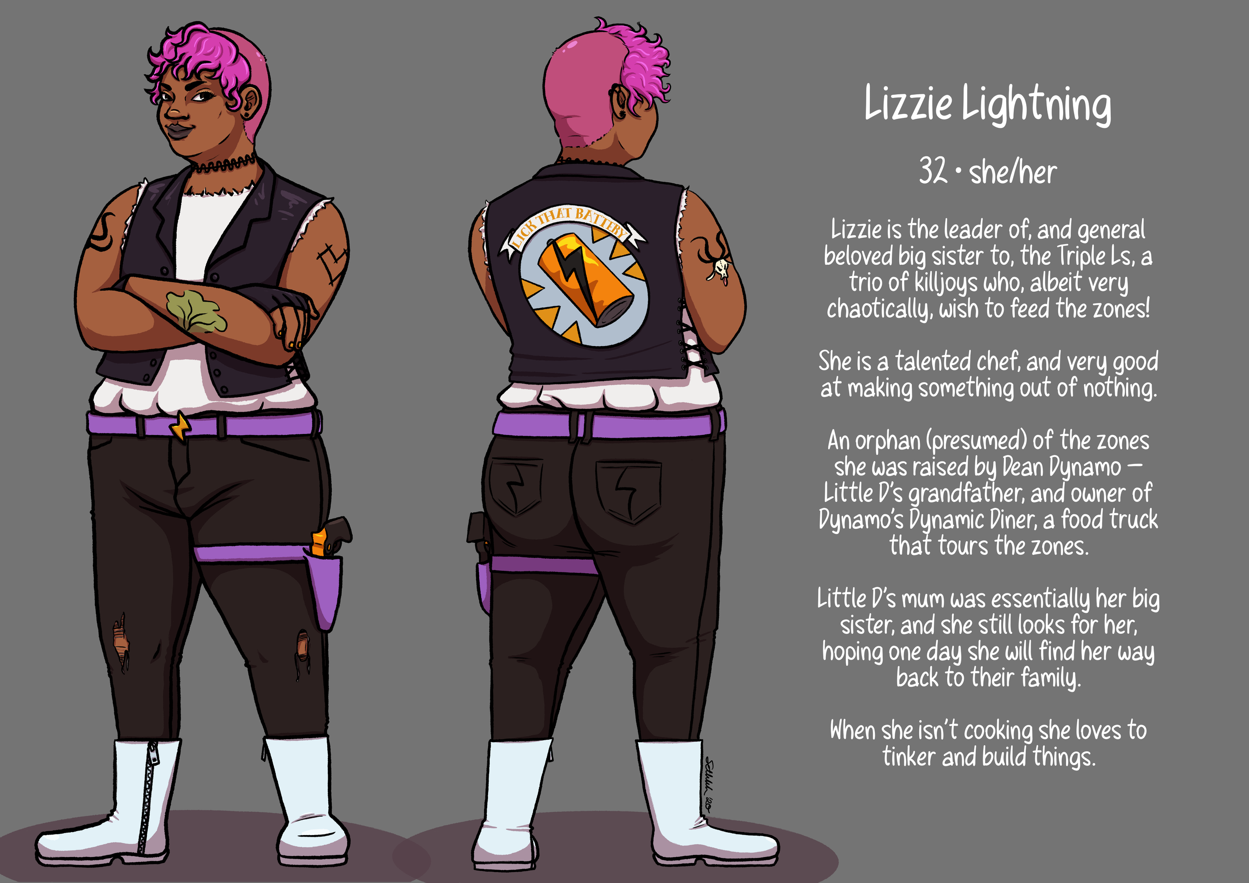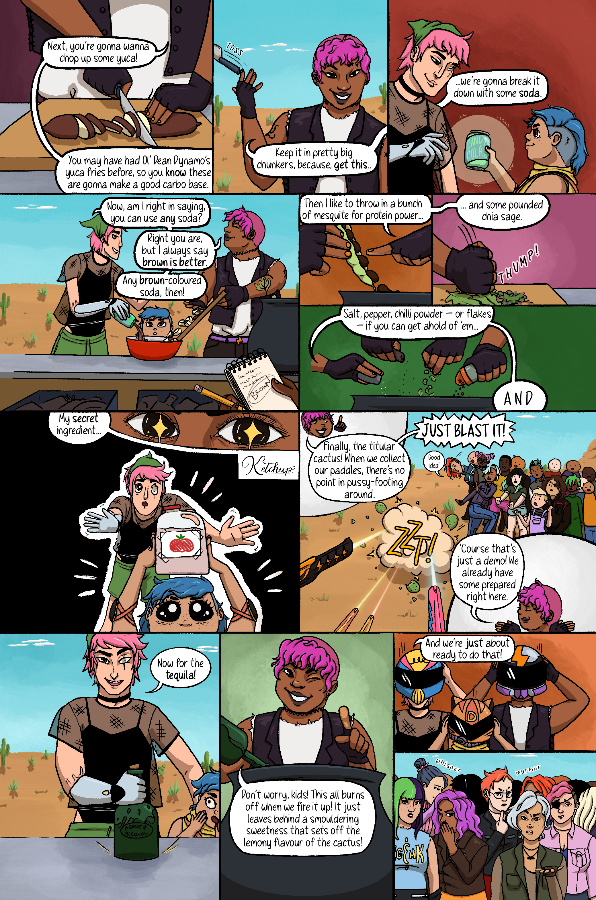 A comic made for Tales from the Zones, a zine celebrating the tenth anniversary of the album Danger Days: The True Lives of the Fabulous Killjoys by My Chemical Romance. The parameters were to make a three-page-or-less comic in-universe; I chose to add some colourful characters of my own to the universe for a short cooking demo/antic-based story.